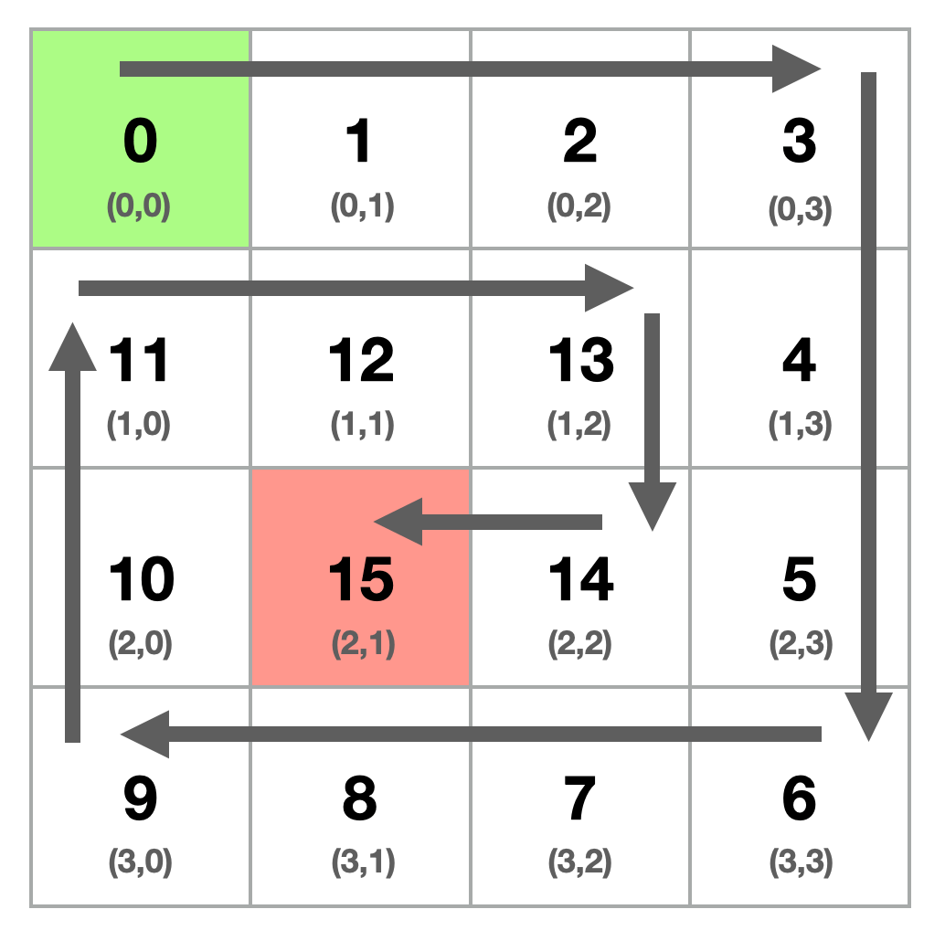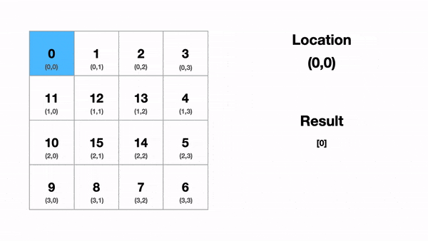 Let's start from the beginning. We start at the top-left (0,0) point. We walk across the first row from the first column to the last column. We are at the top-right point (0,3).